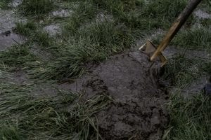 Die waren niet bepaald ideaal. Omdat het in de voorafgaande weken overvloedig had geregend, was het perceel nauwelijks begaanbaar en dat maakte het werk extra zwaar. Ook op vrijdag regende het de eerste uren nog, daarna werd het gelukkig droog. Verder stond er een koude noordoostenwind. Voor de vrijwilligers was het echter geen probleem om een dag lang door het zompige weiland te banjeren. Iedereen was er op gekleed en de stemming was en bleef opperbest. Voor thee en koffie werd gezorgd en tussen de middag kwam een vrijwilliger heerlijke soep brengen.